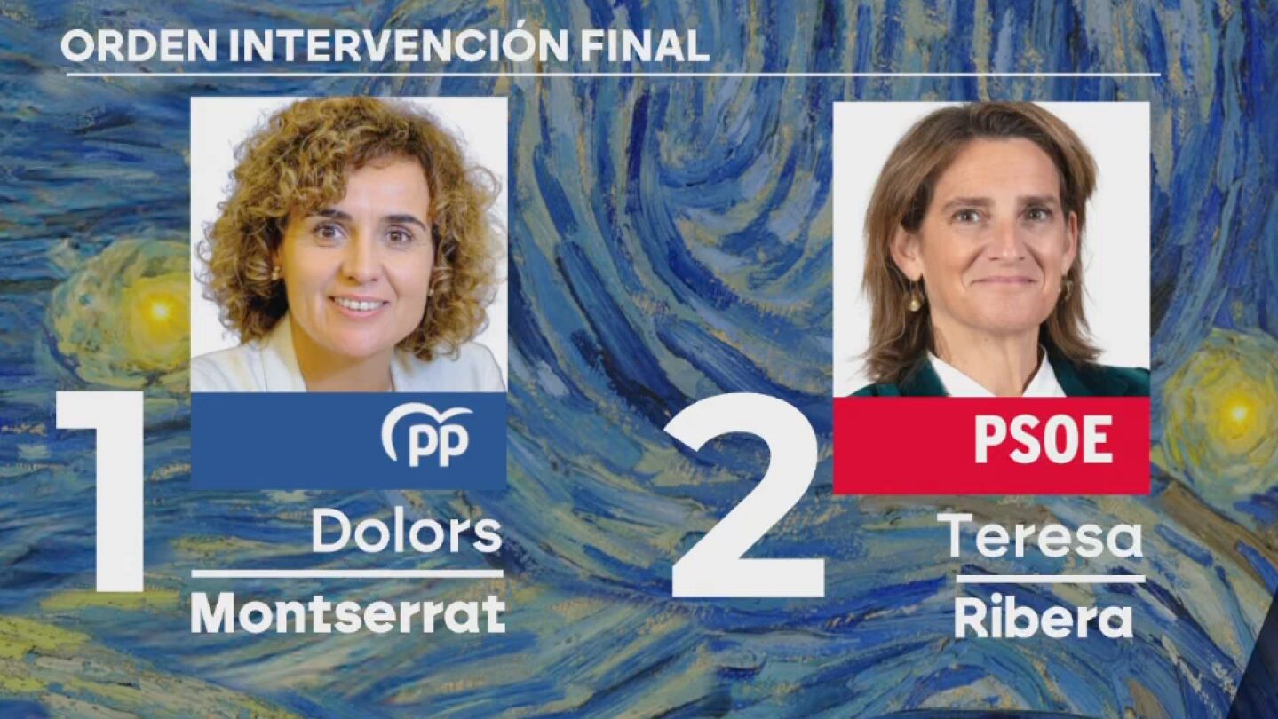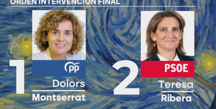 Previamente se ha realizado un sorteo ante notario que ha decidido el orden de las intervenciones de ambas candidatas. De este modo, la primera intervención será para Dolors Monserrat y en segundo lugar le tocará a Teresa Ribera.