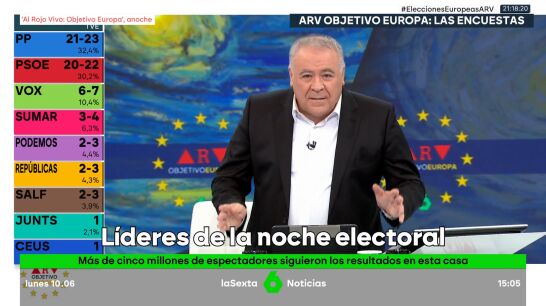 laSexta ha vuelto a ser líder en una noche electoral. La cadena logró que su especial 'Al Rojo Vivo: Objetivo Europa' fuese el más visto del 9J, siendo la opción informativa líder tanto durante 'Las Encuestas' (más de 1,3 millones de espectadores de media y 9,9% de share) como durante 'Los Resultados' (1,3 millones de espectadores de media y 11,7%), alcanzando una media de casi 7 millones de espectadores únicos.