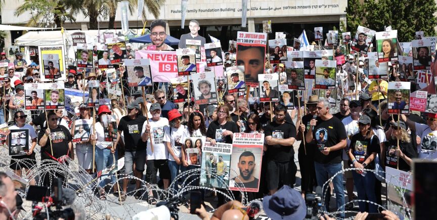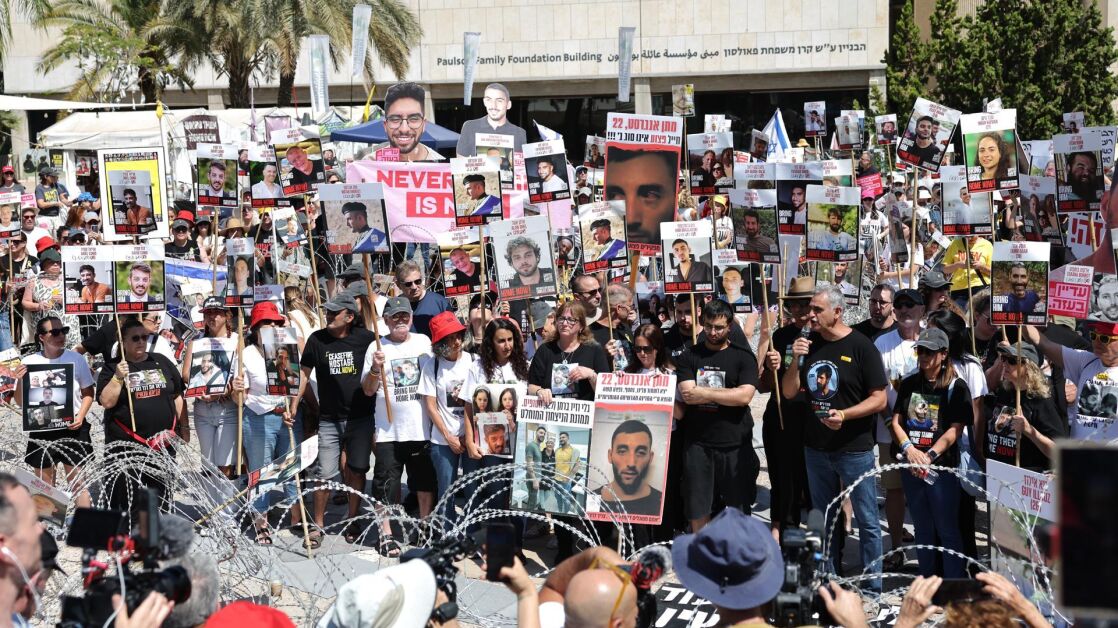 Familiares de rehenes secuestrados por Hamás responden: se manifiestan en Tel Aviv rodeados de alambre de espino