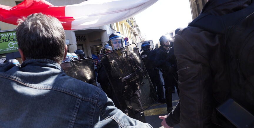 En Niza, los manifestantes se han concentrado en la plaza de Garibaldi y han sido rápidamente cercados por la Policía y poco después los agentes han cargado para disolver la protesta.
