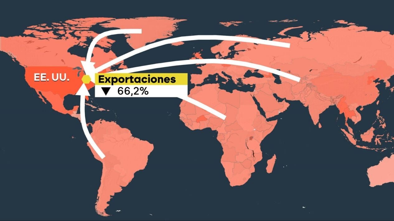 El primer escenario que contempla el estudio parte de la base de los aranceles a Canadá, México y China. En esta situación, la investigación recoge que Estados Unidos perdería más de un quinto de sus exportaciones, que podrían ascender hasta un 30%, según los cálculos. Así, el PIB en EEUU caería un 1,1%, mientras que México y Canadá sufrirían aún más, con un -7% y -5%, respectivamente.