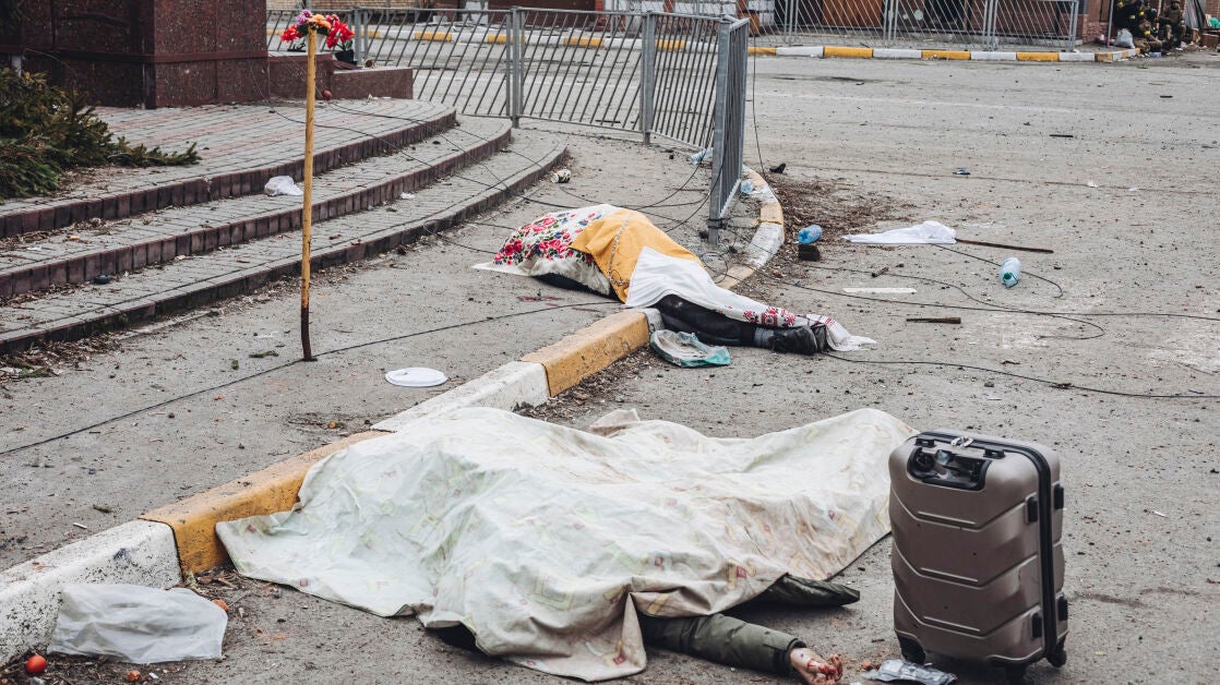 Serhiy no volvió a saber nada de su familia hasta que una publicación en redes le cambió la vida. Cuatro cadáveres destrozados por la metralla. Una mujer, un adolescente y una niña destrozados por la metralla. Junto a ellos, una maleta azul con ruedas, una maleta gris y algunas mochilas. Una de las maletas está abierta. Serhiy reconoce una camiseta de niña rosa, ropa deportiva, calcetines... Es su familia.