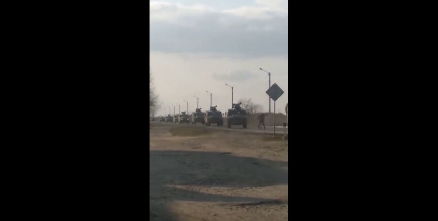 Es la imagen de la rabia y de la impotencia. Un hombre solo ante los tanques. En este caso es Ucrania. Los tanques del ejército ruso recorren una carretera ucraniana mientras un hombre les lanza improperios.