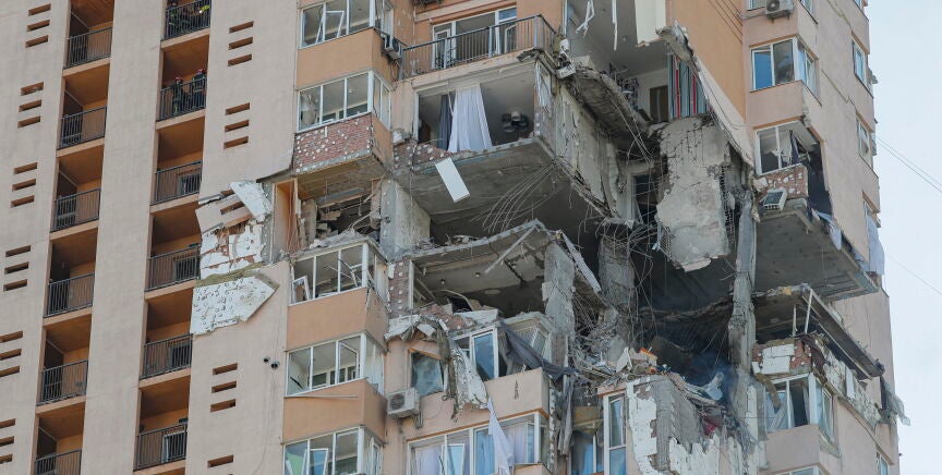 Un misil ruso ha impactado esta madrugada en un edificio de apartamentos al oeste de Kiev, que ha quedado gravemente dañado, dejando un enorme boquete en al menos seis plantas.