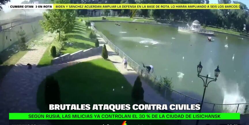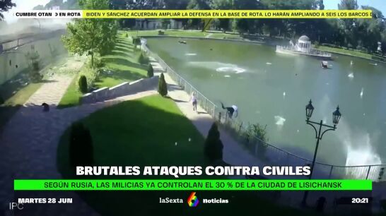 Una cámara de seguridad de un parque que está a escasos metros del centro comercial atacado con misiles rusos captó el momento de la explosión.