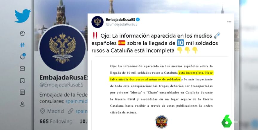 La Embajada rusa se ha hecho eco de las informaciones que indican que Rusia podría haber ofrecido en otoño de 2017 a Carles Puigdemont y la causa independentistas 10.000 soldados para Cataluña, así como costear la deuda de la comunidad. Así lo detalla el auto del titular del Juzgado de Instrucción número 1 de Barcelona, Jesús Aguirre, al que ha tenido acceso laSexta.