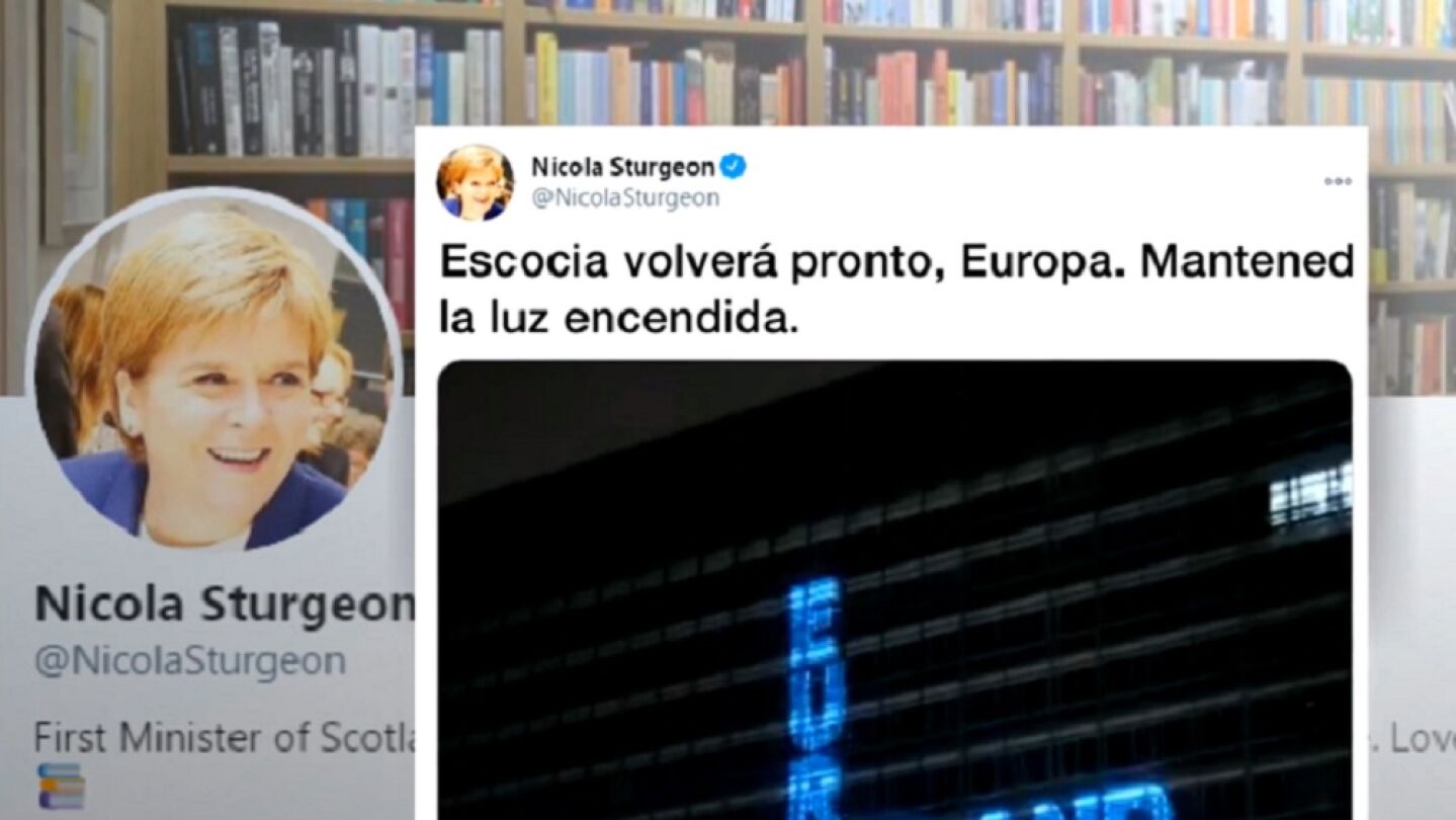 La líder del Partido Nacionalista Escocés (SNP) ha retirado su voluntad de luchar por lograr que una Escocia independiente vuelva, eventualmente, a adherirse al bloque comunitario. En su tuit, Sturgeon ha incluido una imagen con las palabras "Europa" y "Escocia", entrelazadas por un icono de un corazón, una imagen que ya había sido proyectada en un lateral del edificio de la sede de la Comisión Europea en Bruselas, acompañada de este mensaje: "Escocia volverá pronto, Europa. Mantened la luz encendida".