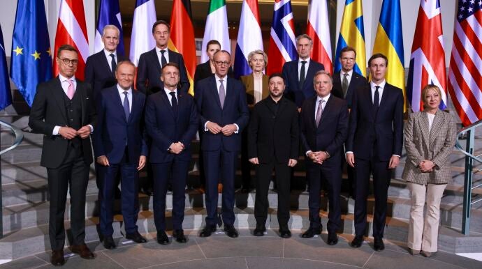 Tras una primera reunión bilateral entre Zelenski y Merz en la cancillería, esta tarde se han sumado los primeros ministros británico, Keir Starmer; polaco, Donald Tusk; sueco, Ulf Kristersson; neerlandés, Dick Schoof; y noruego, Jonas Gahr Støre; las jefas de Gobierno de Italia, Giorgia Meloni; y Dinamarca, Mette Frederiksen; así como el presidente francés, Emmanuel Macron; y el finlandés, Alexander Stubb.