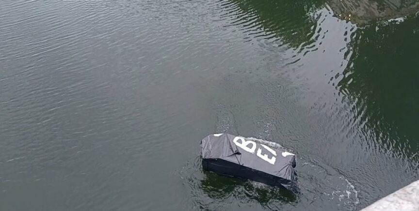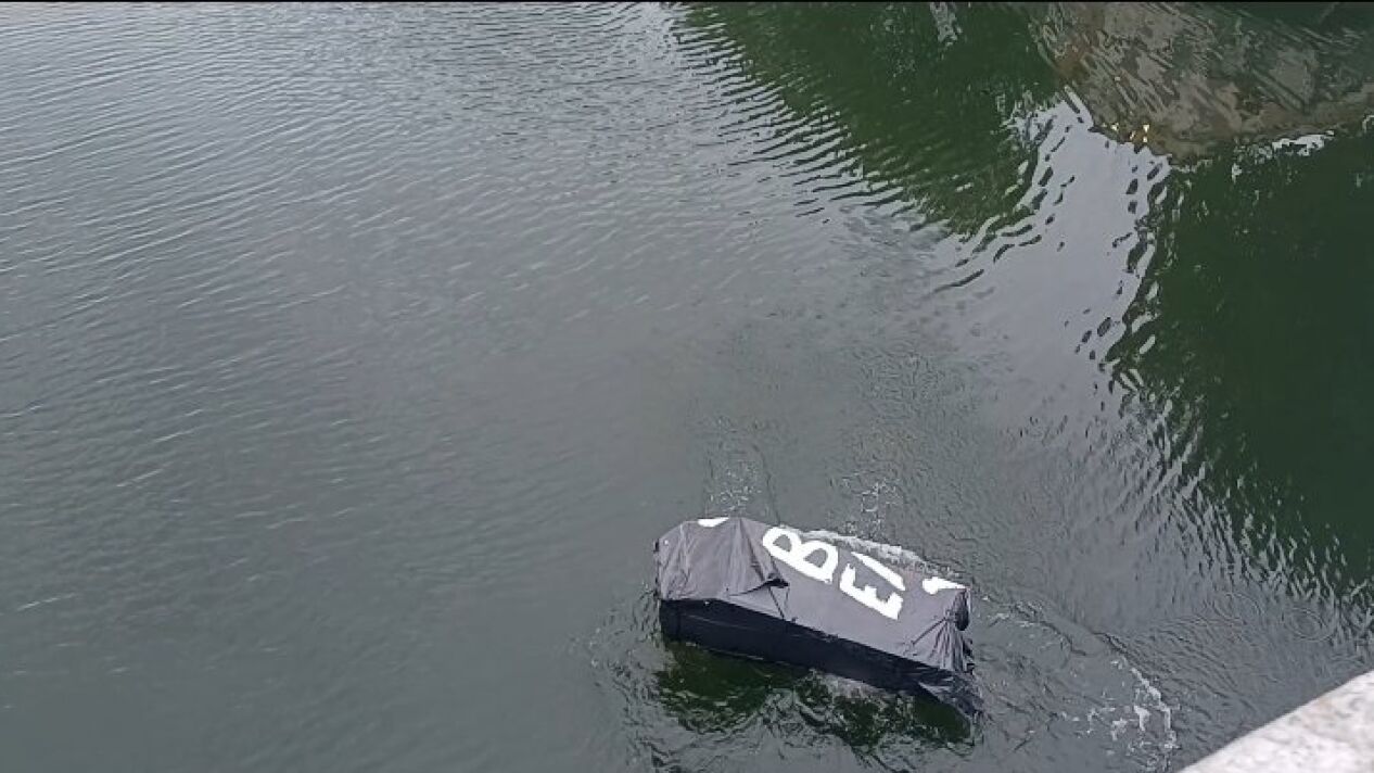 Manifestantes lanzan un ataúd con la leyenda 'RIP Imperio Británico' a un río de Dublín durante el funeral de Isabel II