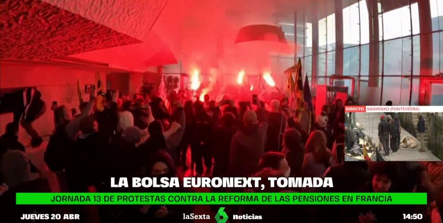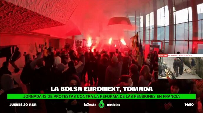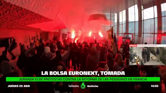 Con bengalas y pancartas, varios cientos de manifestantes han asaltado al mediodía de este jueves el edificio del gestor de la Bolsa parisina. La decimotercera movilización se produce por la decisión del presidente francés, Emmanuel Macron, de aumentar la edad mínima de 62 a 64 años. Con la reforma de las pensiones ya aprobada y validada por el Consejo Constitucional, la próxima gran protesta está convocada para el próximo 1 de mayo.