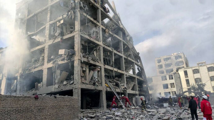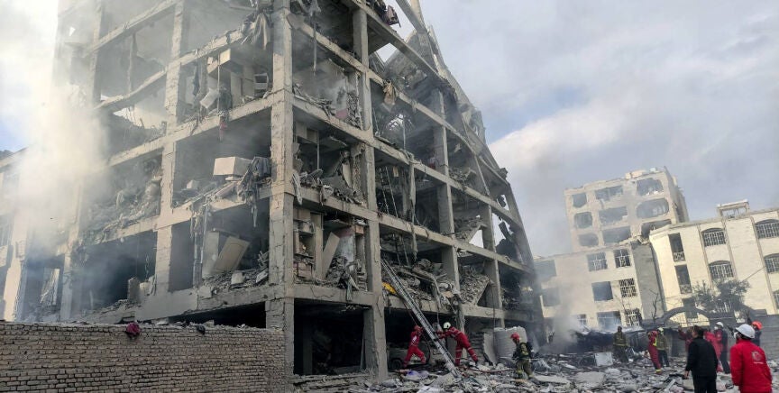 Rescatistas de la Media Luna Roja buscan a los supervivientes en un mar de escombros de este edificio residencial de Irán que ha sido atacado. Una tarea prácticamente imposible, y es que solo queda su estructura.