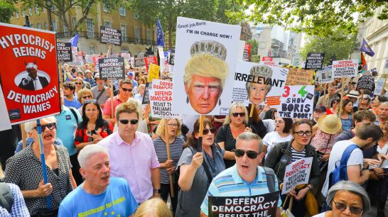 Frente a Downing Street, residencia oficial del jefe de Gobierno en Londres, se congregó una multitud con pancartas que llamaban a "defender la democracia" y "detener el golpe" del conservador Johnson.