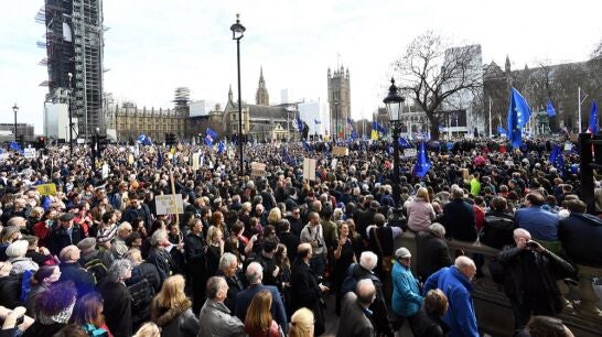 La mayor protesta contra el Brexit ha acabado a las puertas del Parlamento, donde la próxima semana se prevé que los Comunes se pronuncien por tercera vez sobre el acuerdo con la Unión Europea. Aunque May, ante lo que se prevé un nuevo fracaso, ya ha dicho que no presentará la propuesta si no tiene suficientes apoyos.