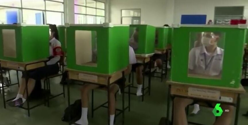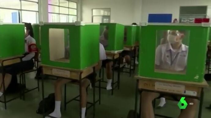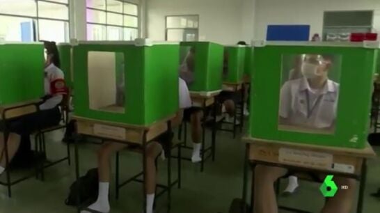 Las medidas frente al coronavirusde cara a la vuelta al cole en distintos países del mundo dejan estampas tan llamativas como la de un colegio de Tailandia que, además de imponer el uso de la mascarilla, ha ido más lejos y ha instalado mamparas de plástico en cada pupitre para evitar que el virus viaje de un alumno a otro.