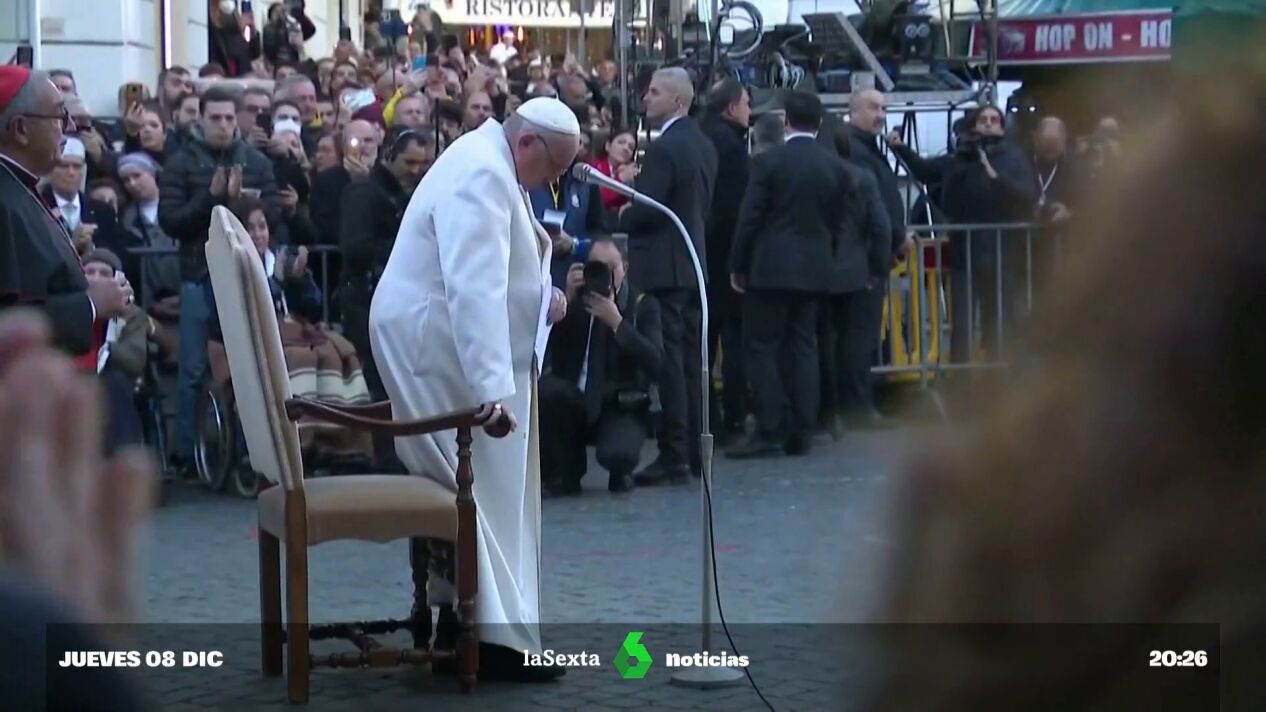 Antes de marcharse de la Plaza de España, el Papa ha saludado, a pie y luego con la ayuda de una silla de ruedas, a los numerosos fieles que han rezado junto a él. Tres horas antes, en el Angelus, había pedido a los fieles presentes en la plaza de San Pedro que se unieran a él espiritualmente en el gesto de veneración de la Inmaculada Concepción, a cuya intercesión ha encomendado "el deseo universal por la paz, especialmente por la martirizada Ucrania, que tanto sufre".