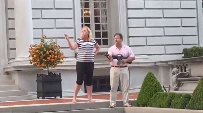 Una pareja apunta con armas de fuego a manifestantes frente a su mansión en EEUU