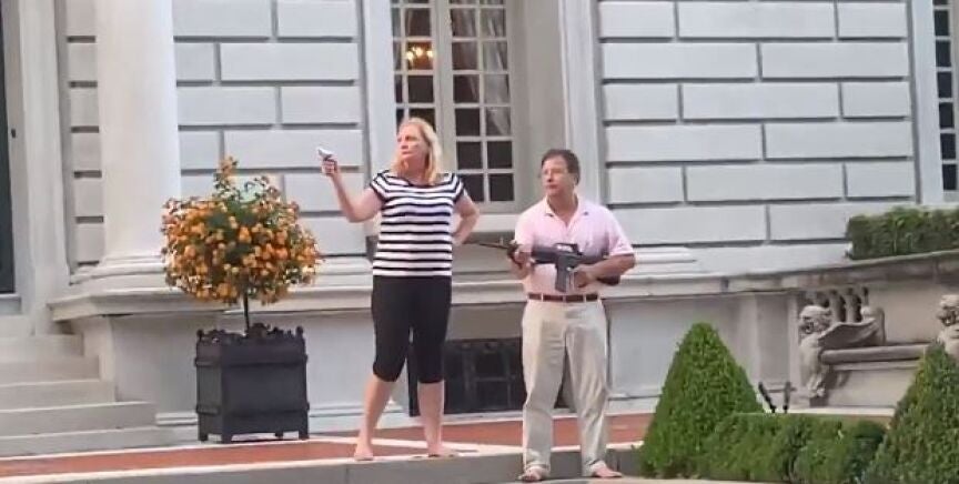 Un matrimonio de Saint Louis, Missouri (Estados Unidos), apuntó con armas de fuego a un grupo de manifestantes que pasaban frente a su casa, camino de la residencia de la alcaldesa de la ciudad para pedir su dimisión. En varios vídeos difundidos a través de las redes sociales, puede verse cómo la mujer apunta con una pistola a los manifestantes, mientras el hombre lo hace con un rifle.
