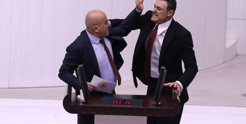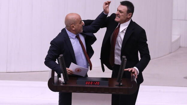 En ese momento, el diputado Alpay Özalan, de la formación del presidente, saltó a la tribuna y le agredió por la espalda, desatando un tumulto que acabó con varios diputados heridos e incluso sangrando. Una parlamentaria ha tenido que ser trasladada al hospital.