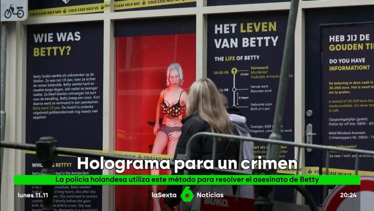 La Policía de Ámsterdam usa un holograma para resolver el asesinato de una prostituta húngara de 19 años, Bernadett "Betty" Szabó, y ha instalado en el Barrio Rojo un holograma de la víctima, que estará activo toda esta semana, en un intento de lograr nuevas pistas que puedan conducir al autor del trágico apuñalamiento que sacudió Países Bajos en 2009.