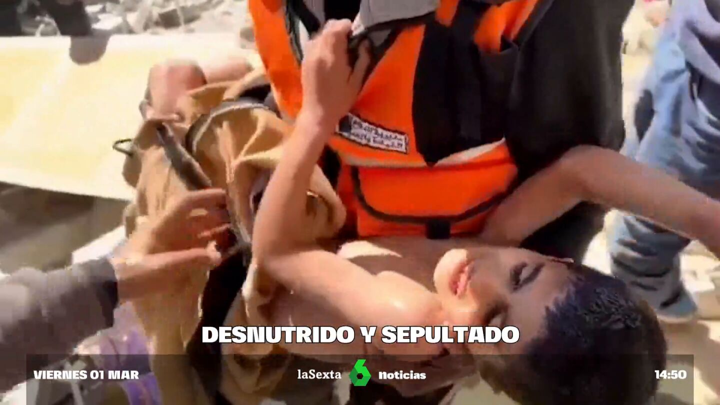 Ahmed descansa exhausto e inmóvil sobre los brazos de uno de sus salvadores, no deja de agarrarle con una mano. Los servicios de emergencia intentan mantenerlo con vida. La ayuda humanitaria no llega a la ciudad de Gaza y tras nueve días atrapado, está completamente desnutrido. "Nueve días bajo los escombros. Lo rescatamos a los 9 días, es un esqueleto. Vamos a llevarlo al hospital", dice uno de los rescatistas.