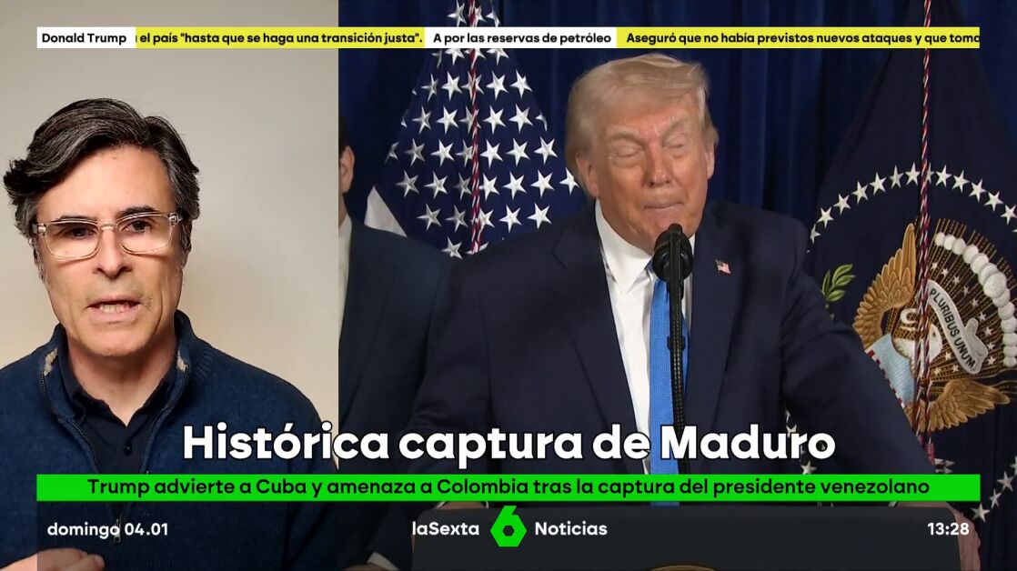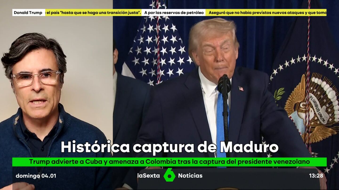 En laSexta Noticias, Sandro Pozzi, experto en internacional de Al Rojo Vivo, analiza el interés de Donald Trump en el operativo contra Venezuela. Según Pozzi, el presidente estadounidense utiliza la rueda de prensa para redefinir el concepto de "América first", presentando la operación como un esfuerzo por preservar el dominio de Estados Unidos en el Hemisferio Occidental. Trump advirtió a Cuba y amenazó a Colombia tras la captura del presidente venezolano, buscando asegurar vecinos estables. Pozzi subraya que Trump desglosa sus complejos objetivos, en este caso, el acceso a recursos energéticos.