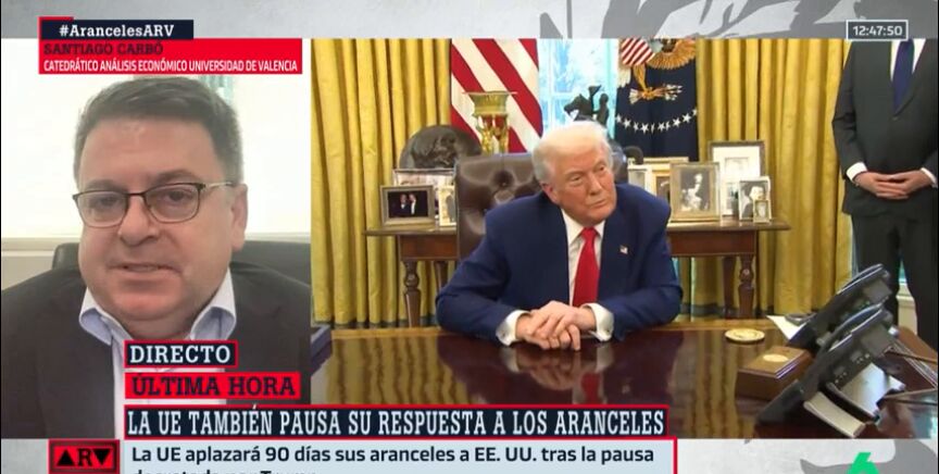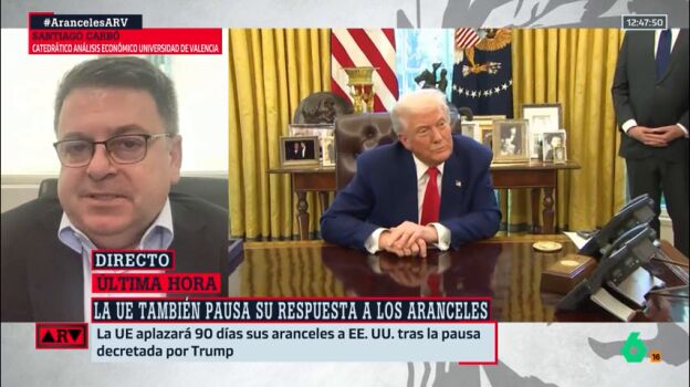 Santiago Carbó ha destacado en Al Rojo Vivo que la decisión de la UE le parece "prudente y sabia" a pesar de que es cierto que es EEUU quien ha generado el problema. "Trump ha dado marcha atrás para la parte más gruesa de los aranceles y ha mostrado una intención de negociar", ha apuntado.