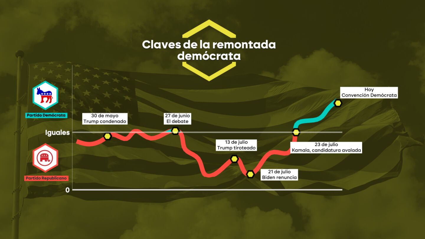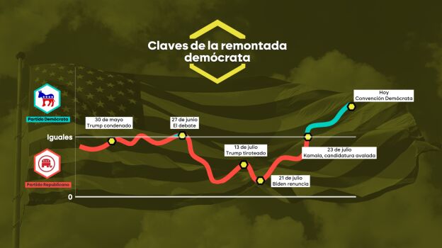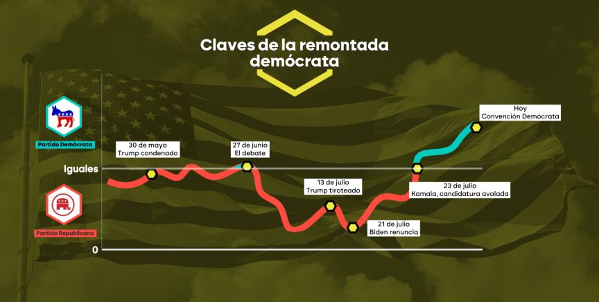 El partido demócrata sacan entre dos y cinco puntos de ventaja a los republicanos en las encuestas. Analizamos seis fechas clave de esta remontada democrática.