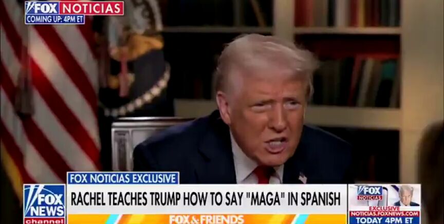 "Señor presidente, me gustaría enseñarle a decir 'Make America Great Again' en español. 'Vamos a hacer América grande otra vez'", indicaba Campos-Duffy. Y un aplicado Trump repetía -más o menos- su lema, si bien con una pronunciación mejorable: "America grande otra vez". Y todo en la misma entrevista en la que el republicano planteó dar "dinero y un billete de avión" a migrantes en situación irregular para que se 'autodeporten'.