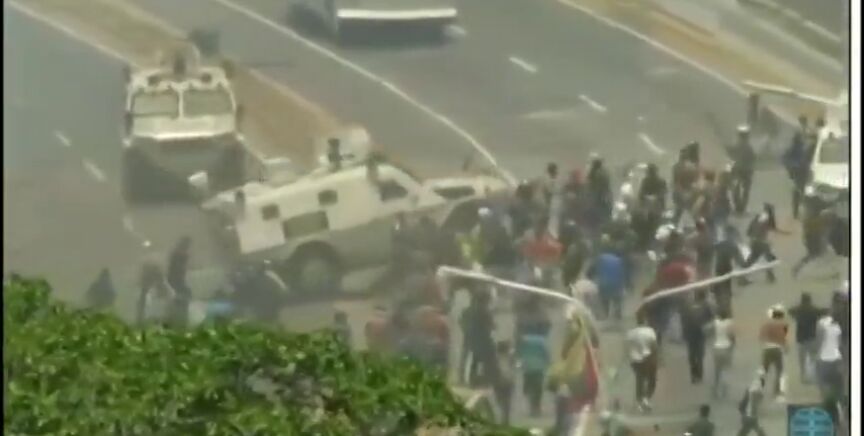 En el vídeo se puede observar a varios manifestantes frente a los tanques y una posterior embestida de los vehículos a los opositores de Maduro.