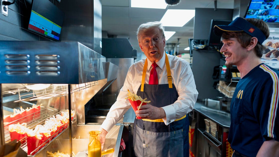 Trump cocina patatas fritas en un McDonald's y afirma, sin pruebas, que Harris nunca trabajó en uno