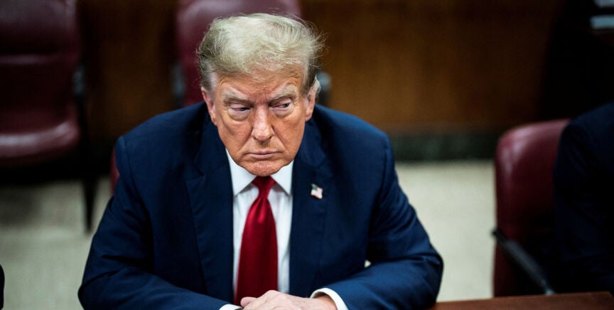 Serio y en silencio. Así se ha sentado en el banquillo de los acusados Donald Trump este lunes por la tarde. Se trata del primer expresidente de Estados Unidos en hacerlo. Se enfrenta a cuatro años de prisión por presuntamente extorsionar a la que fue actriz porno Steffany Clifford, más conocida como Stormy Daniels.
