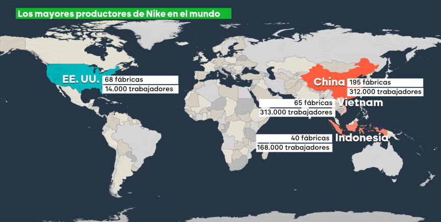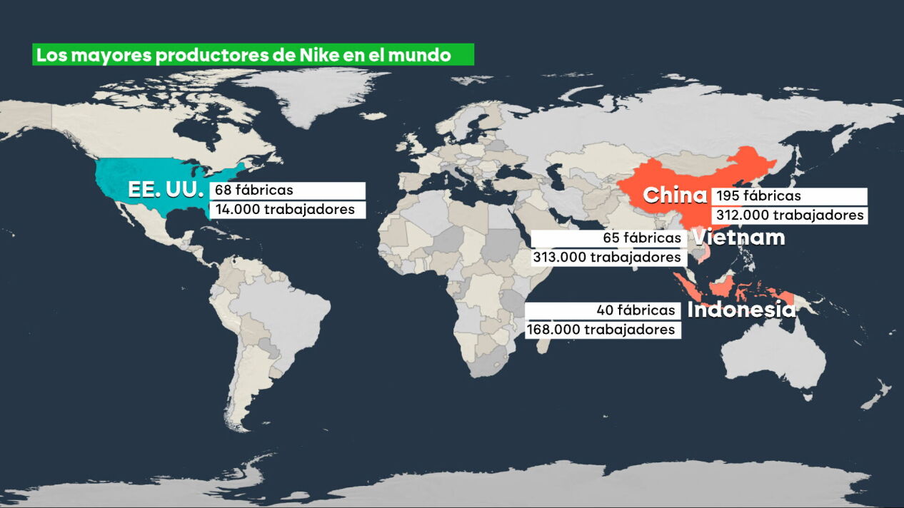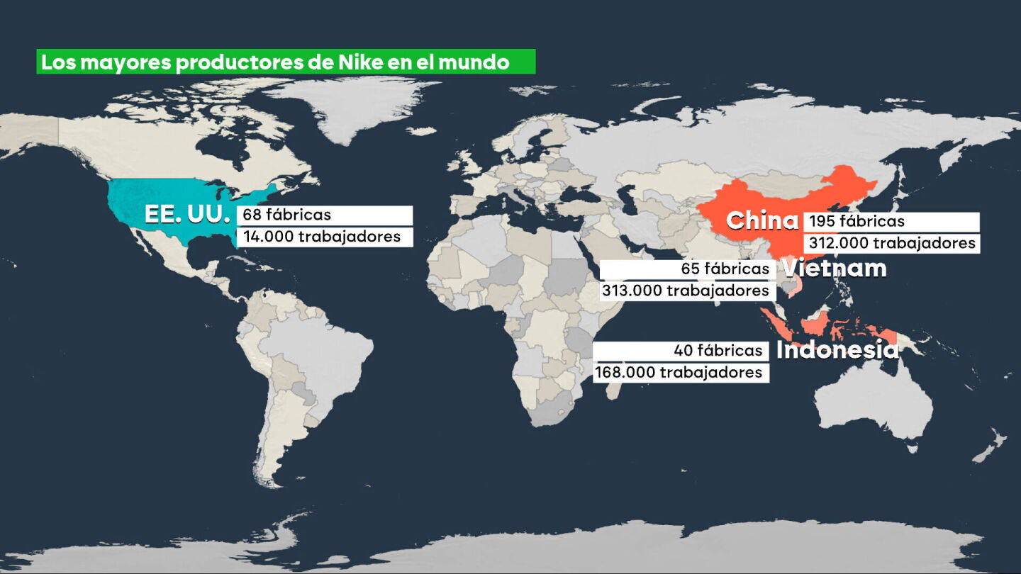 Tiene su sede en Oregón, pero casi todos los productos de Nike se fabrican fuera de Estados Unidos. Principalmente en Vietnam, China e Indonesia, países que han recibido aranceles de lo más duros. Allí trabajan, en total, unas 800.000 personas, frente a las 14.000 que lo hacen en su país de origen.