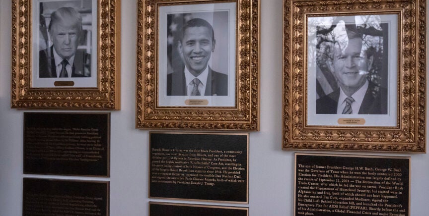 La placa de Obama (2009-2017) hace referencia a su nombre completo, "Barack Hussein Obama", y lo describe como "una de las figuras políticas más divisivas de la historia de Estados Unidos".