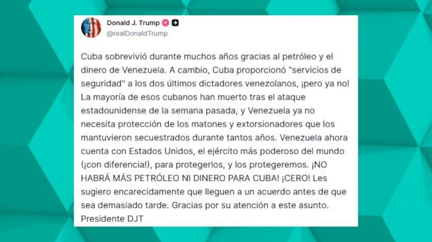 "A cambio, Cuba proporcionó 'servicios de seguridad' a los dos últimos dictadores venezolanos. La mayoría de esos cubanos han muerto tras el ataque estadounidense de la semana pasada y Venezuela ya no necesita protección de los matones y extorsionadores que los mantuvieron secuestrados durante tantos años. Venzuela ahora cuenta con EEUU, el Ejército más poderoso del mundo (con diferencia) para protegerlos", añade el mandatario.