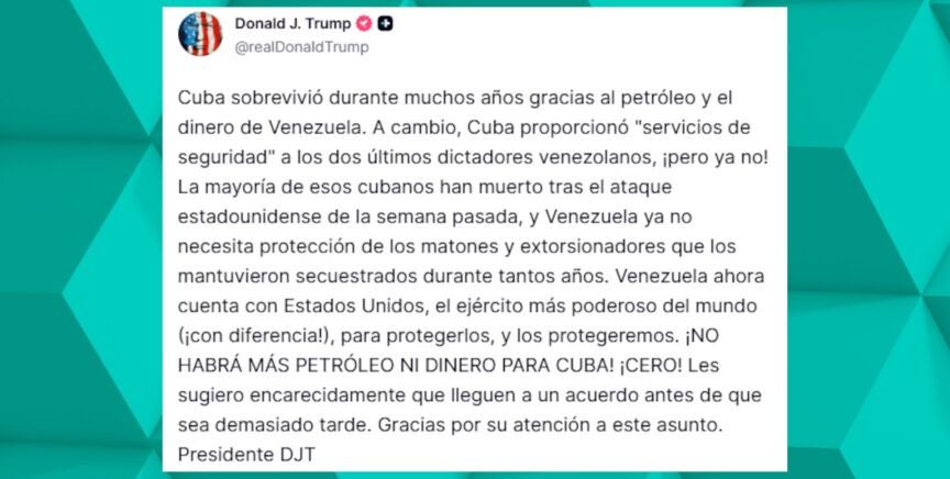 El presidente de Estados Unidos, Donald Trump, advirtió a Cuba que dejará de recibir dinero y petróleo de Venezuela, acusando a la isla de haber vivido gracias a estos recursos a cambio de servicios de seguridad para Hugo Chávez y Nicolás Maduro. Trump declaró que Venezuela ahora cuenta con el apoyo del ejército estadounidense. En respuesta, el Gobierno cubano, a través de su ministro de Relaciones Exteriores, Bruno Rodríguez, negó haber recibido compensación por servicios de seguridad y criticó a Estados Unidos por su comportamiento coercitivo. El presidente cubano, Miguel Díaz-Canel, afirmó que Cuba está preparada para defenderse y reivindicó su derecho a importar petróleo sin interferencias.