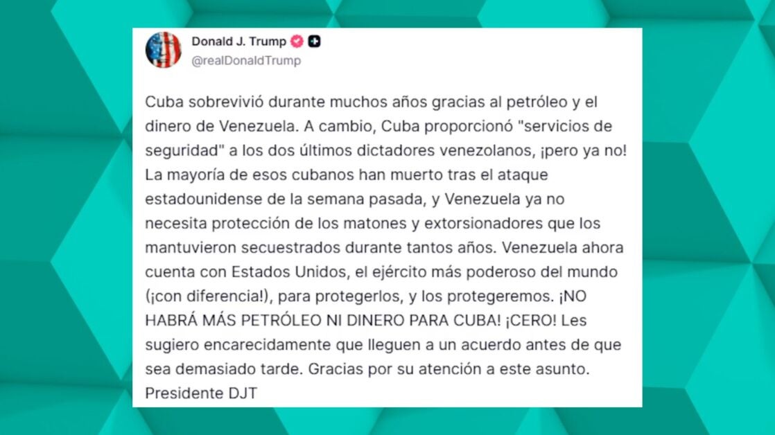 Así, "¡NO HABRÁ MÁS PETRÓLEO NI DINERO (de Venezuela) PARA CUBA!": "¡CERO! Les sugiero (a Cuba) que lleguen a un acuerdo antes de que sea demasiado tarde", añadió el republicano, que desde la captura de Nicolás Maduro vienen pronosticando que el Gobierno cubano caerá pronto.