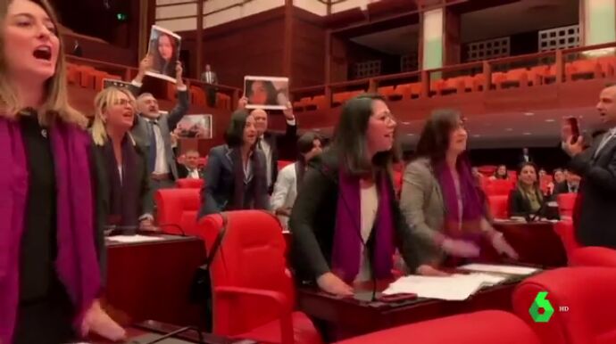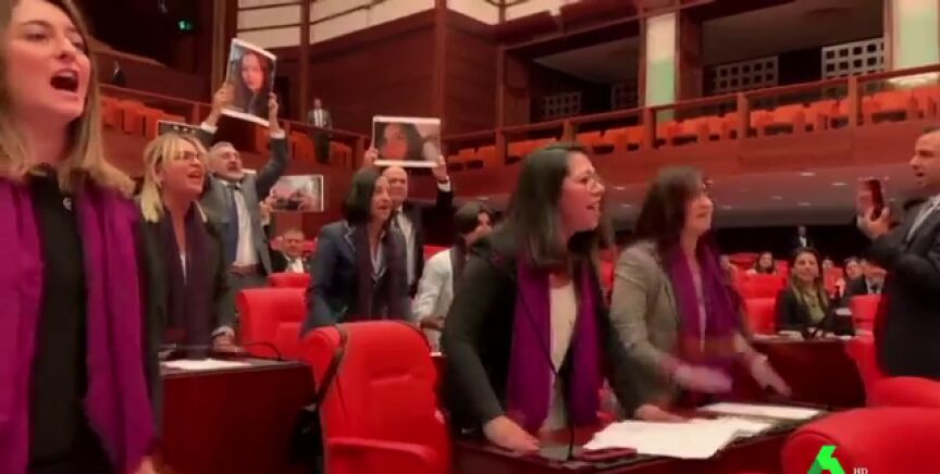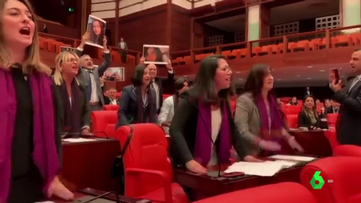 El grito feminista 'El violador eres tú' recorre el mundo. Ahora ha llegado hasta el parlamento turco. Una veintena de diputadas han coreado el canto, mostrando las fotos de 20 mujeres asesinadas por sus parejas. Su objetivo era protestar por la represión violenta de una manifestación feminista el pasado 7 de diciembre.