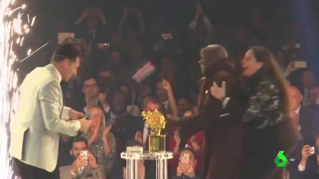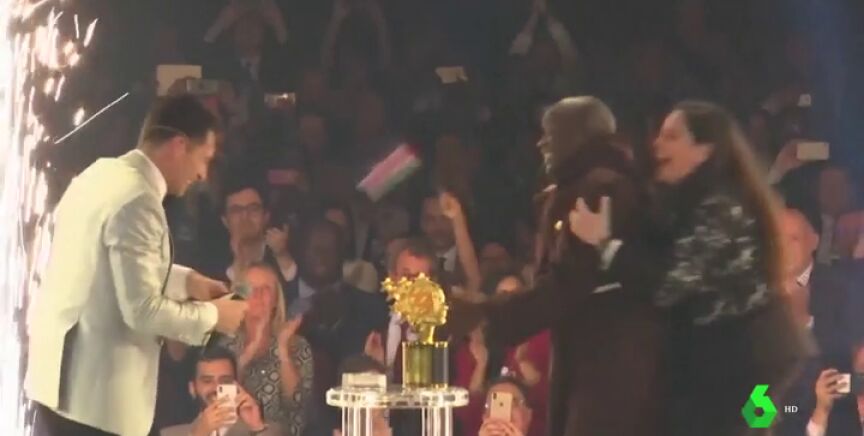 Ataviado con su hábito de monje franciscano, se abrazó con el presentador, el actor Hugh Jackman y recibió el galardón, valorado en un millón de dólares, de manos del príncipe heredero de Dubai.