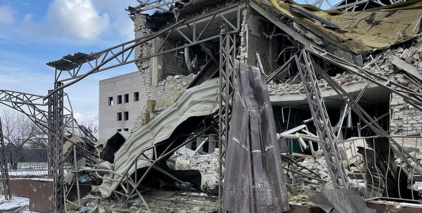Los bombardeos han tirado abajo el edificio, en el que apenas se distinguen las estructuras y solo se pueden ver escombros por el suelo.