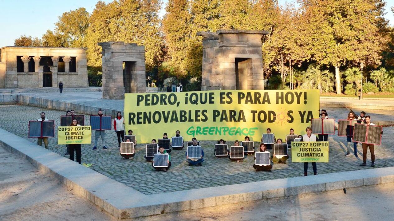 Greenpeace coloca placas solares en el Templo de Debod y exige a Sánchez llevar al COP27 "compromisos de justicia climática"