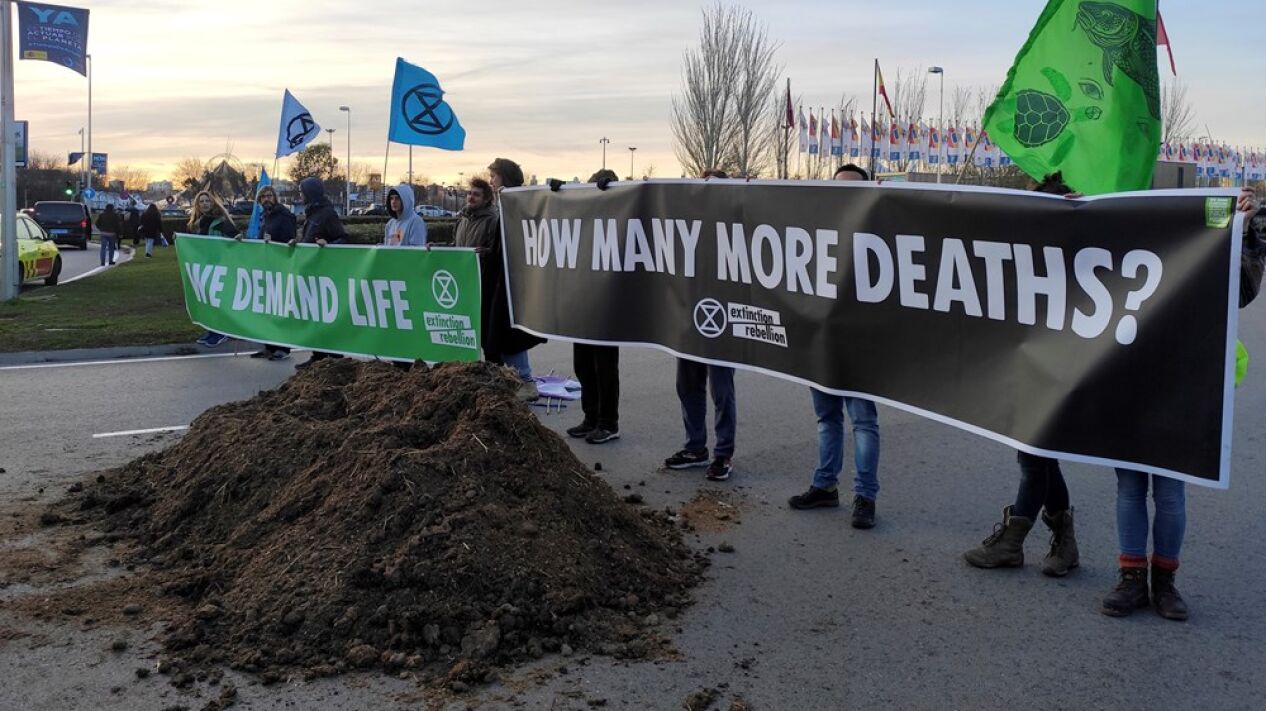Un activista del movimiento Extinction Rebellion se ha aproximado a las puertas de la Feria de Madrid (Ifema), donde se celebra la Cumbre del Clima, al volante de un camión cargado de estiércol, cuyo contenido ha volcado para denunciar que "estamos en la mierda" por la falta de acuerdo contra la crisis climática.