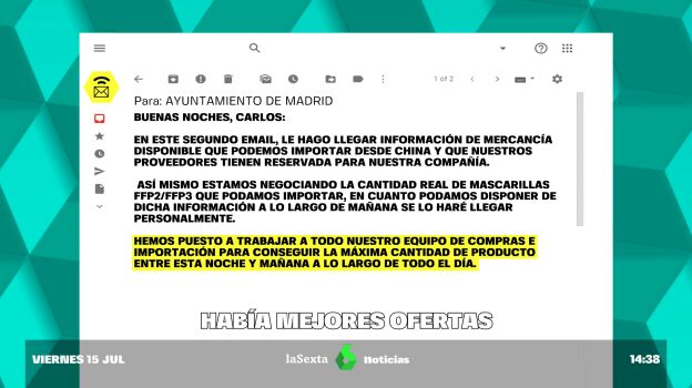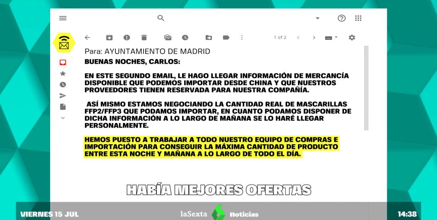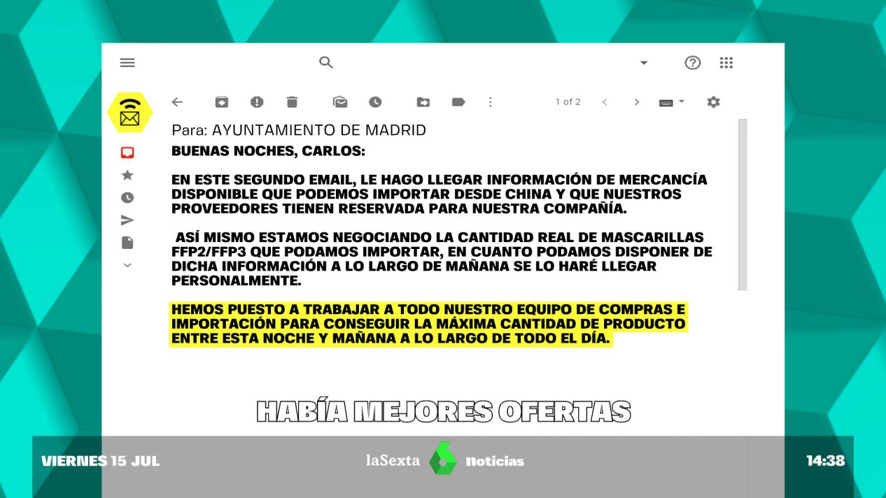 Según consta en varios correos electrónicos a los que ha accedido laSexta, el Ayuntamiento de Madrid sí pudo elegir entre ofertas de material sanitario más baratas y con plazos de entrega más cortos que las de los comisionistas Medina y Lueceño.