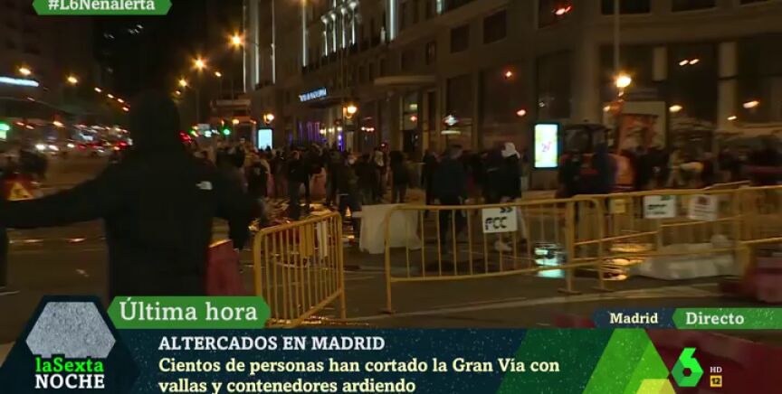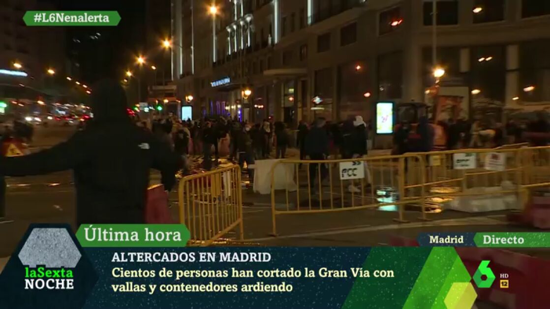 Disturbios en Madrid: cortan la Gran Vía con vallas y contenedores ardiendo y tiran objetos a la Policía