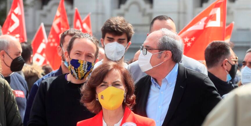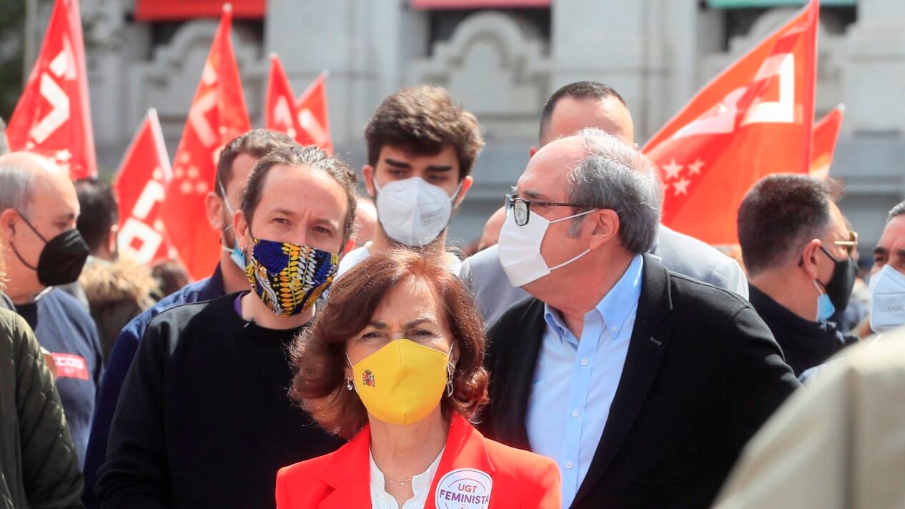 Ángel Gabilondo, Pablo Iglesias y Mónica García han marchado unidos antes de la cita electoral. También presentes los líderes de CCOO y UGT, Unai Sordo y Pepe Álvarez, que piden al Gobierno que cumpla con los compromisos que se han aplazado cuando llegó la pandemia de coronavirus.
