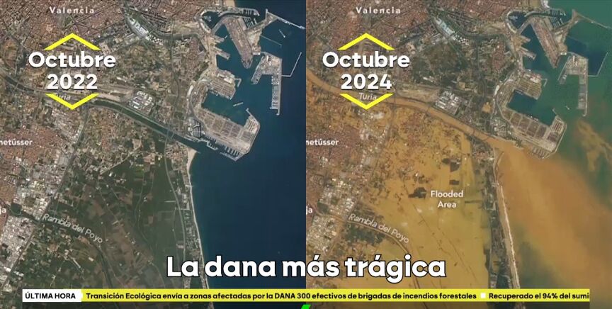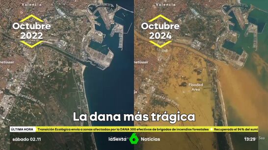 Joanna Ivars, meteoróloga de laSexta, compara y analiza dos imágenes captadas vía satélite de antes y después del paso de la DANA por Valencia, la peor en la historia de España. Estas pertenecen a octubre de 2022 y a octubre de 2024. La imagen es desoladora, ya que el paisaje ha cambiado por completo y las consecuencias van a perdurar en el tiempo.