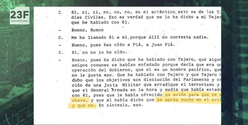 En esta conversación que mantenía clasificada la Guardia Civil y a la que el Gobierno ha levantado el secreto, García Carrés habla con un interlocutor sobre que los guardias civiles que estaban en el Congreso iban a emitir un "manifiesto" para recabar apoyos. El falangista informa a su interlocutor de que esta iniciativa se la ha contado a él mismo el propio Tejero, que le ha llamado y que el texto lo estaban "pasando a máquina", según ha informado Servimedia.