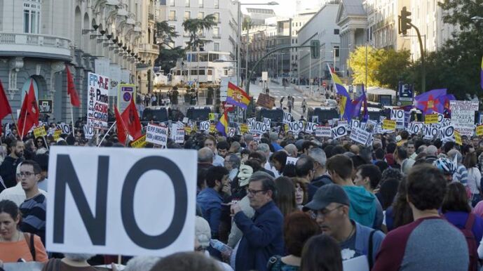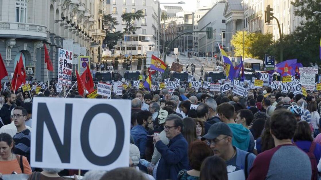 Poco después de las seis de la tarde la cabecera de la marcha con el lema "Ante el golpe de la mafia democracia" y gritos de "Que no, que no que no nos representan", "Vergüenza me daría ser Susana Díaz" o "PSOE-PP, la misma mierda es", los asistentes iniciaban su recorrido portando pancartas con eslóganes como "No a la mafia golpista" y "El PP engaña y amordaza" desde el Paseo del Prado en dirección a la madrileña Puerta del Sol.