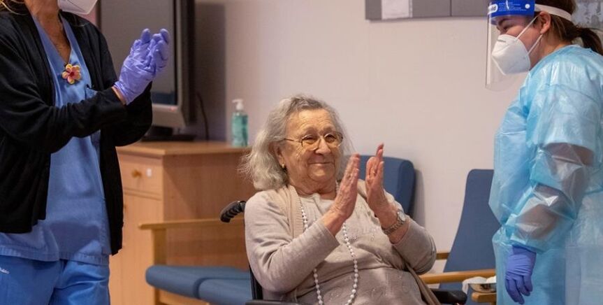 Este domingo todos los que han recibido la vacuna contra el COVID-19, conscientes de que se trata de un día histórico, han lucido sus mejores galas. Bernardina, residente en Hondarribia, ha sido la elegancia personificada y tampoco ha faltado la sombra azul en los párpados de Emilia, la pionera en recibir la vacuna en Aragón. "El día que coja a mis hijas no las soltaré en no sé cuánto tiempo", ha expresado.