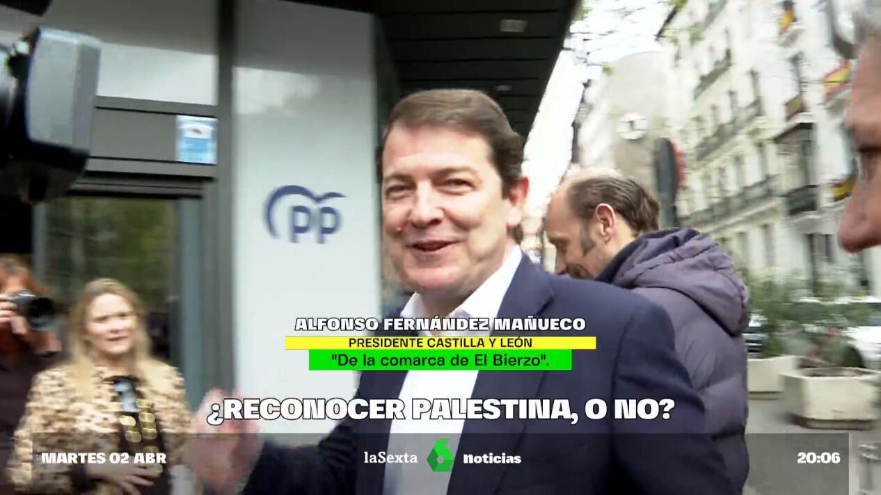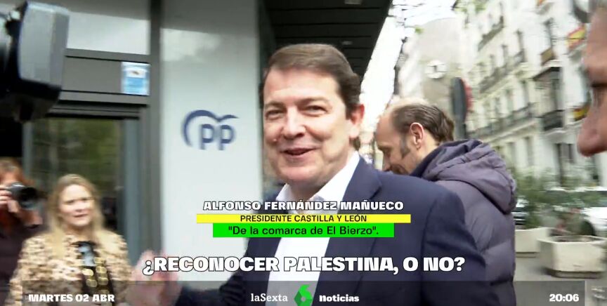 La periodista de laSexta, Ángela Vera, le ha preguntado este martes al presidente de Castilla y León, Alfonso Fernández Mañueco, si está "a favor, o no, del reconocimiento del Estado palestino" y el popular se ha limitado a responder "Buff. De la comarca de El Bierzo".