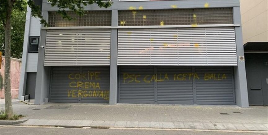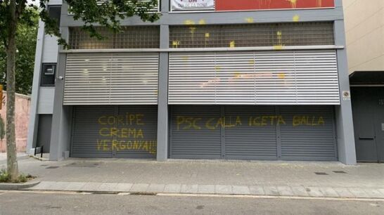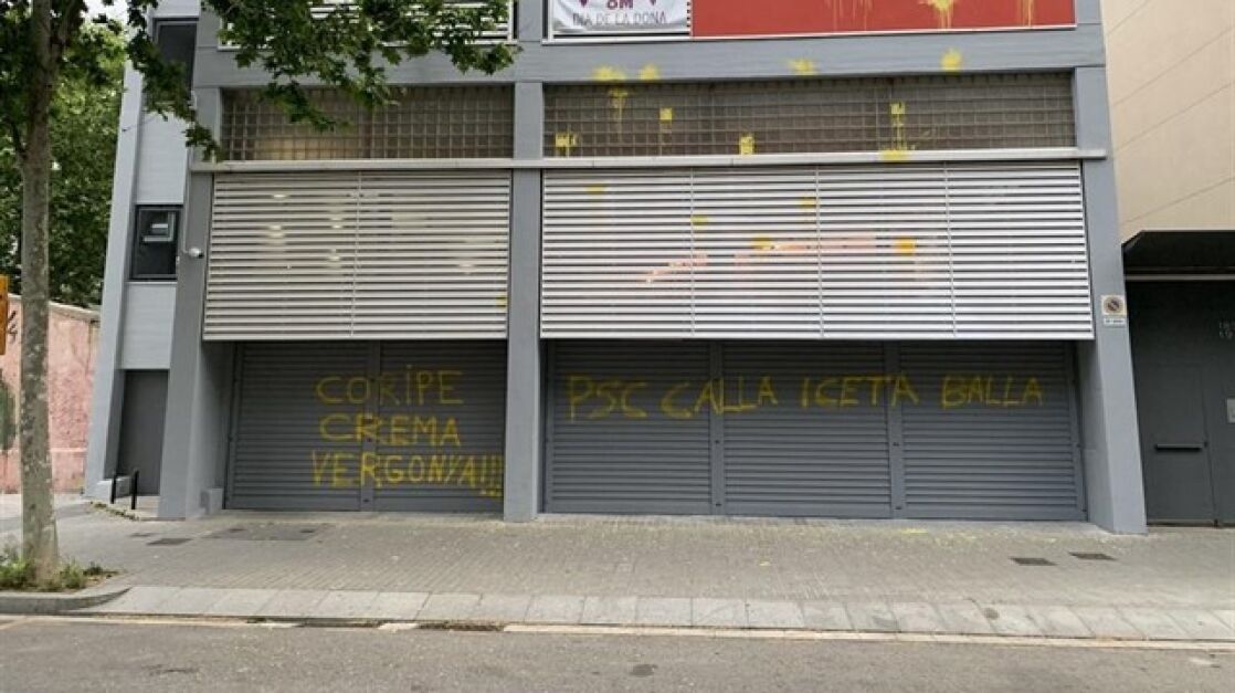 La sede del PSC ha amanecido este lunes con pintadas amarillas en las que se puede leer 'Coripe Arde Vergüenza' en referencia al pueblo sevillano gobernado por los socialistas donde se disparó y quemó un muñeco que representaba al expresidente Carles Puigdemont.